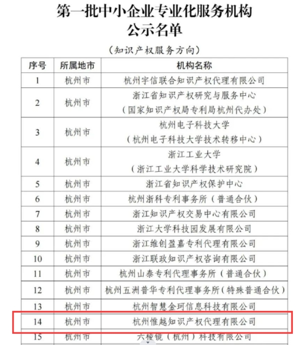 喜報??!關(guān)于杭州惟越知識產(chǎn)權(quán)代理有限公司入選浙江省首批中小企業(yè)專業(yè)化服務(wù)機(jī)構(gòu)的公示